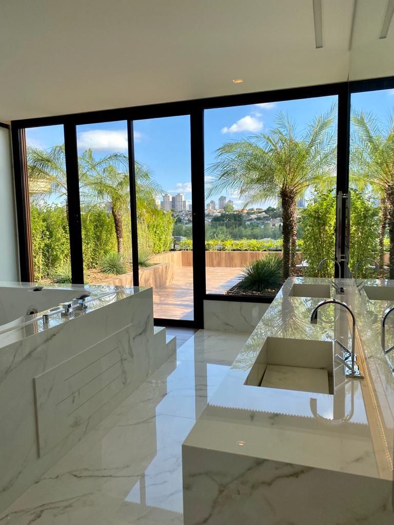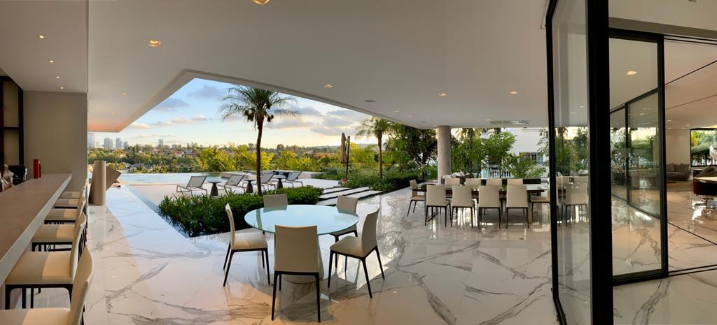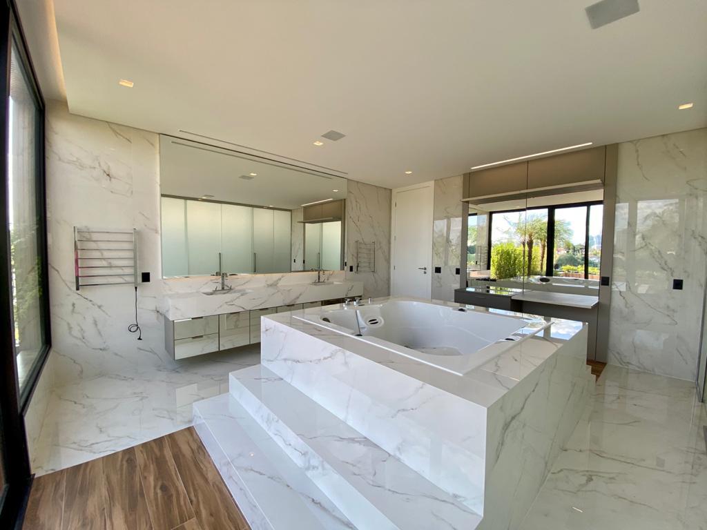 Os produtos Slabs Calacatta Statuario 160x160 e o Slabs Calacatta Gold 160x320 foram aplicados no piso do living, varanda gourmet, escadaria e no banheiro.