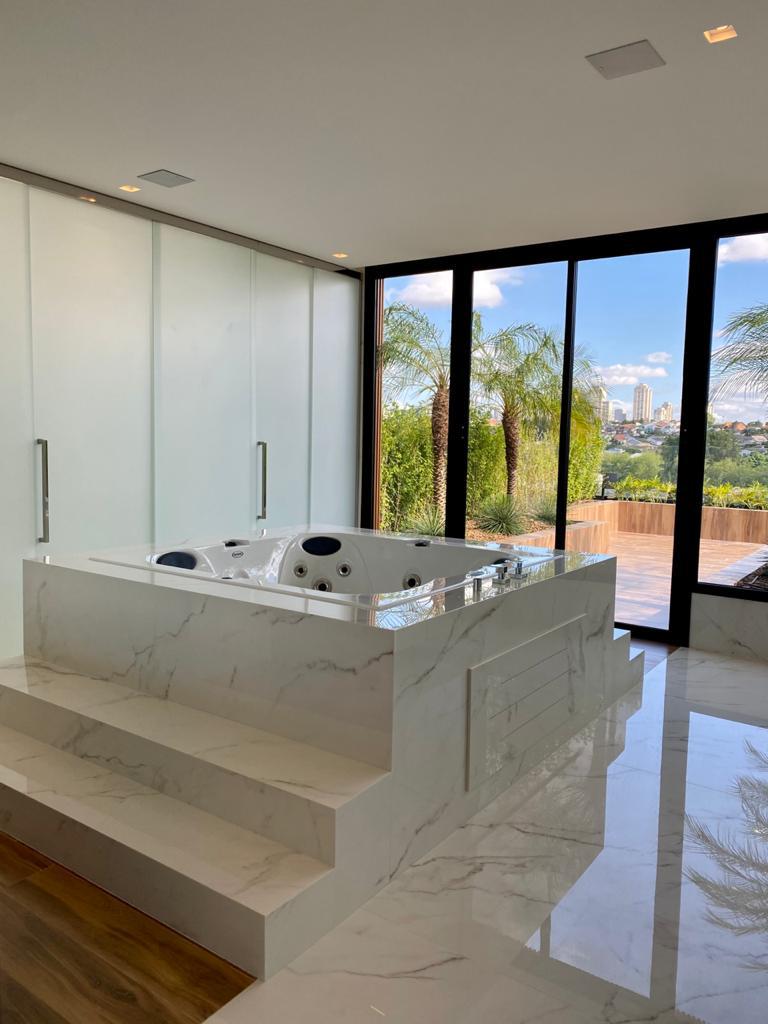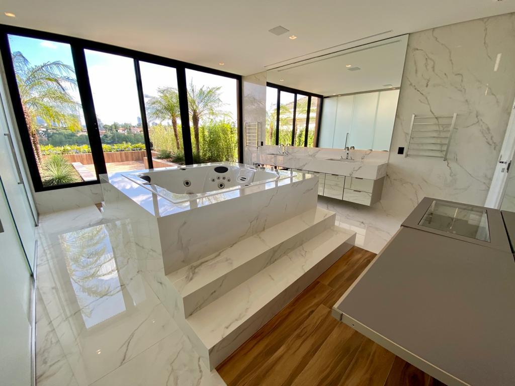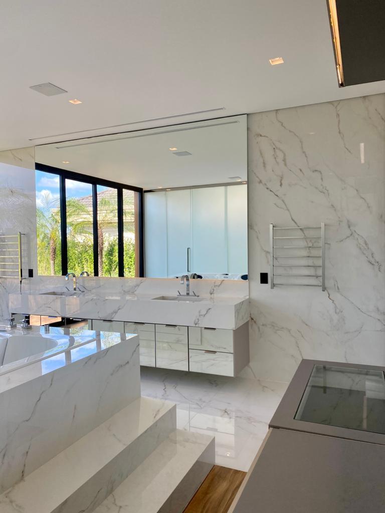 Os produtos Slabs Calacatta Statuario 160x160 e o Slabs Calacatta Gold 160x320 foram aplicados no piso do living, varanda gourmet, escadaria e no banheiro.
